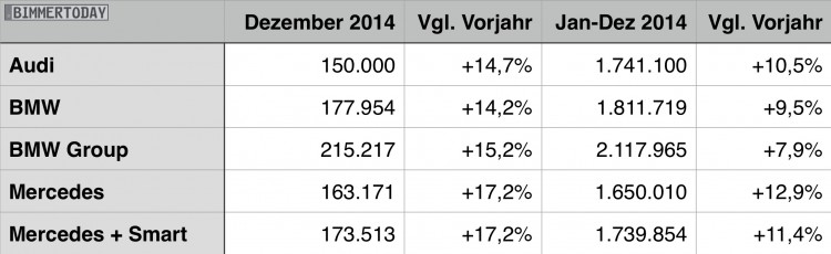 Роль Spitzenreiters обеспечил при этом с полновластной плата BMW Group, продажи в декабре 2014 года на 15,2 процента, на 215.217 единиц, удалось увеличить. Это позволяло расстояние на преследователей и дальше развиваться, потому что и Audi, а также Mercedes-Benz с 150.000 соответственно 173.513 единиц значительно меньше автомобилей, проданных по.